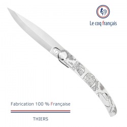 Le Coq Français est un fabricant artisanal français de couteaux à Thiers, capitale de la coutellerie. Les manches sont gravés au laser recto/verso les décors sont de véritables fresques qui vous feront voyager dans un univers mêlant la richesse, la culture et le patrimoine. Vous pourrez vous identifier et retrouver votre propre histoire.